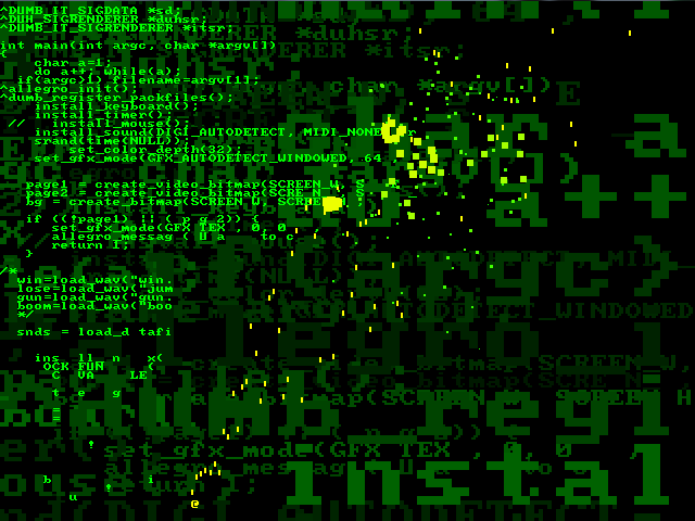 A game that glitches itself by traversing its own memory and corruting its values whilst visualising the process and ultimately, crashing. Made for Ludum Dare 28.