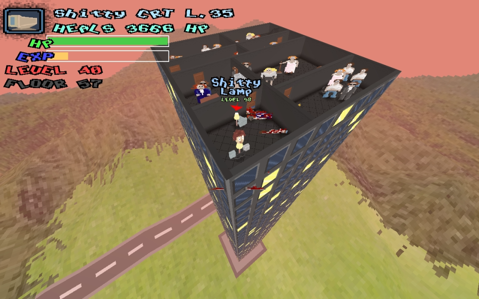 Get to the top floor of the office building of your new job. Gather furniture and replace your body parts with it, also eat them or throw them. Made for Indie Buskers
